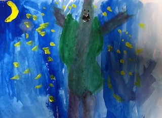 キャンバスにアクリル絵具。 背景も工夫して頑張りました。