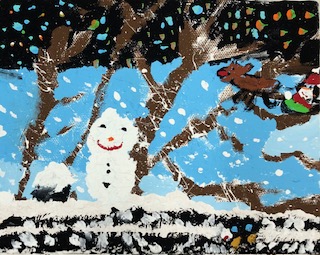 キャンバスにアクリル絵具。木の雪のつもり感がいい!シマエナガもおるね。