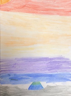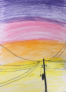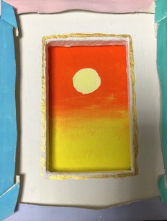 夕焼けの絵。水彩と キャンバスにアクリル絵具と パステル。